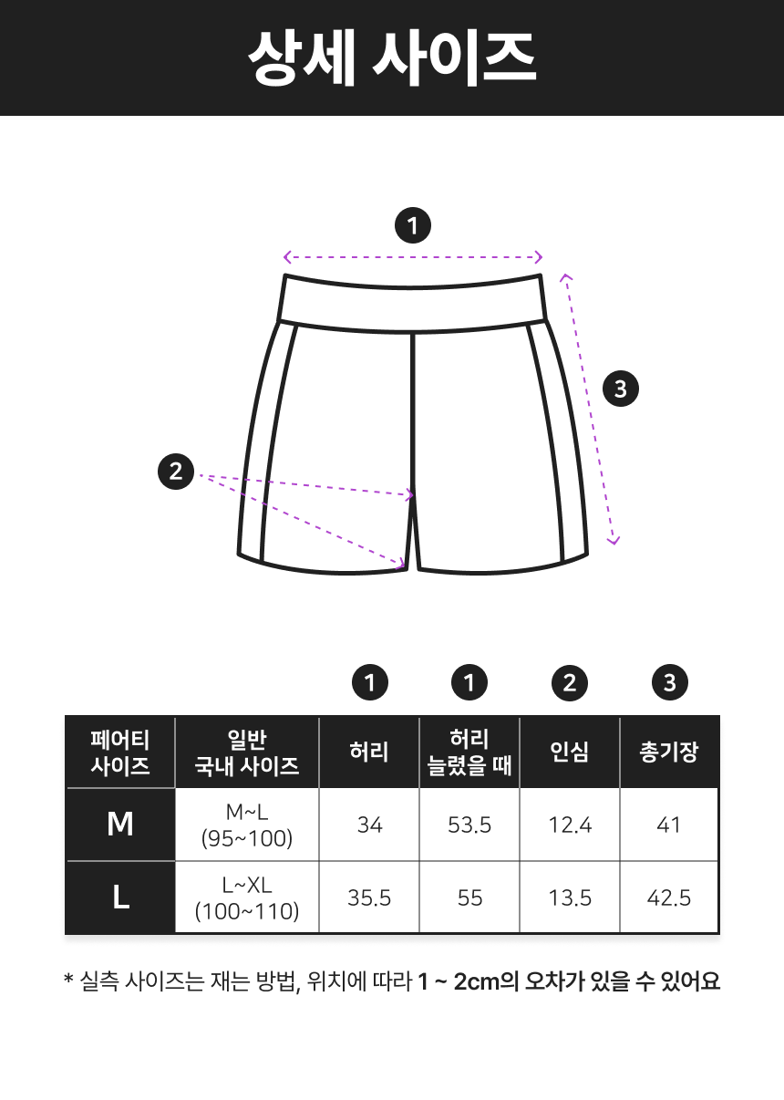 - 사이즈 측정 위치, 방법에 따라 사이즈표와 1~2cm 오차 가능성 있음