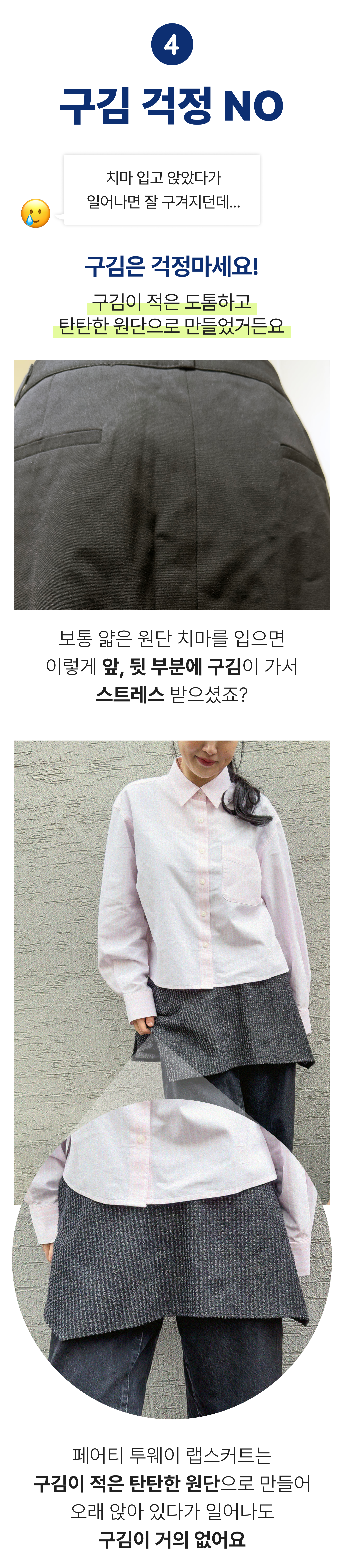 - 스판 제품은 원단 특성상 물세탁 후 건조 시 5% 정도 수축이 있을 수 있으나 착용 후 자연스럽게 다시 회복됨